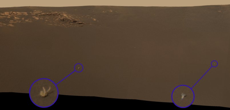 Na výřezu jsou vyznačeny dva zajímavé kameny. Nebo možná nějaké smetí vytroušené při přistání modulu. Do dalších spekulací se nepouštím, králíky celkem vylučuji a jen jsem dost zvědavý na další snímky a výzkum. Opportunity se právě zabývá zkoumáním "hlíny" a podle tohoto snímku má levý "kámen" někde přímo před sebou, možná právě zakrytý ramenem s přístroji, nebo šikmo vpředu. Pokud bude ke skalám pokračovat rovně, bude jej míjet velice blízko.