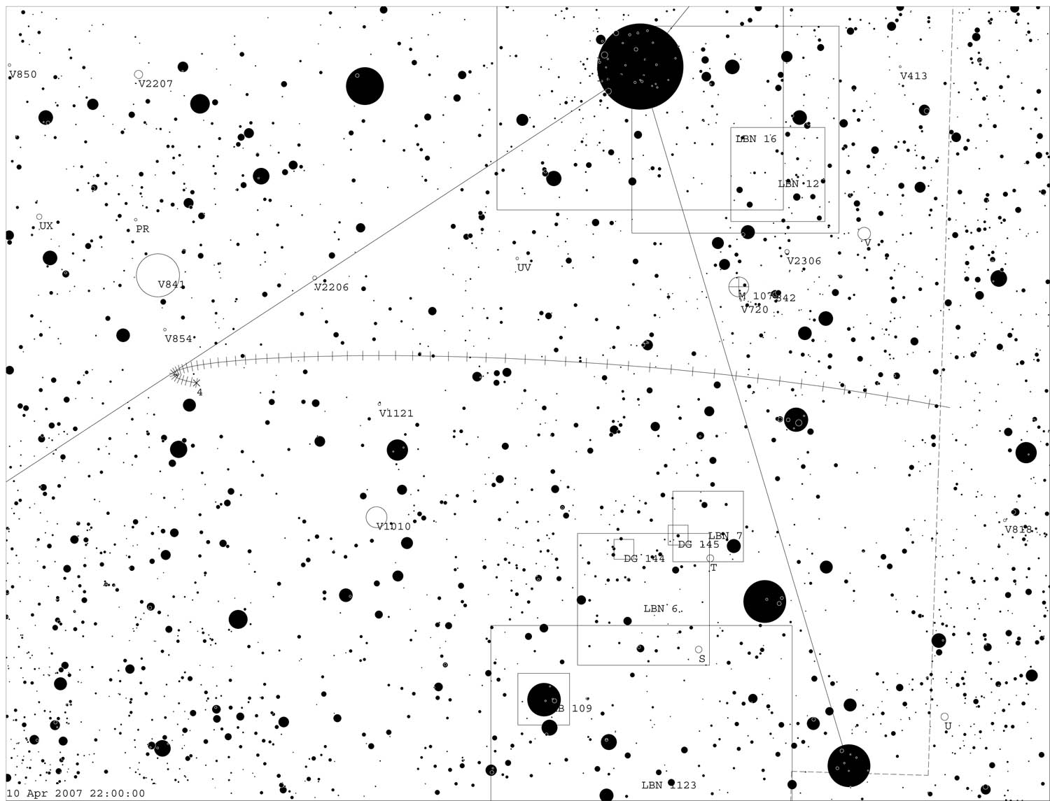 Mapka ukazuje pohyb planétky po jednom dni od 10. 4. 2007 pre 22h 00m Selč.