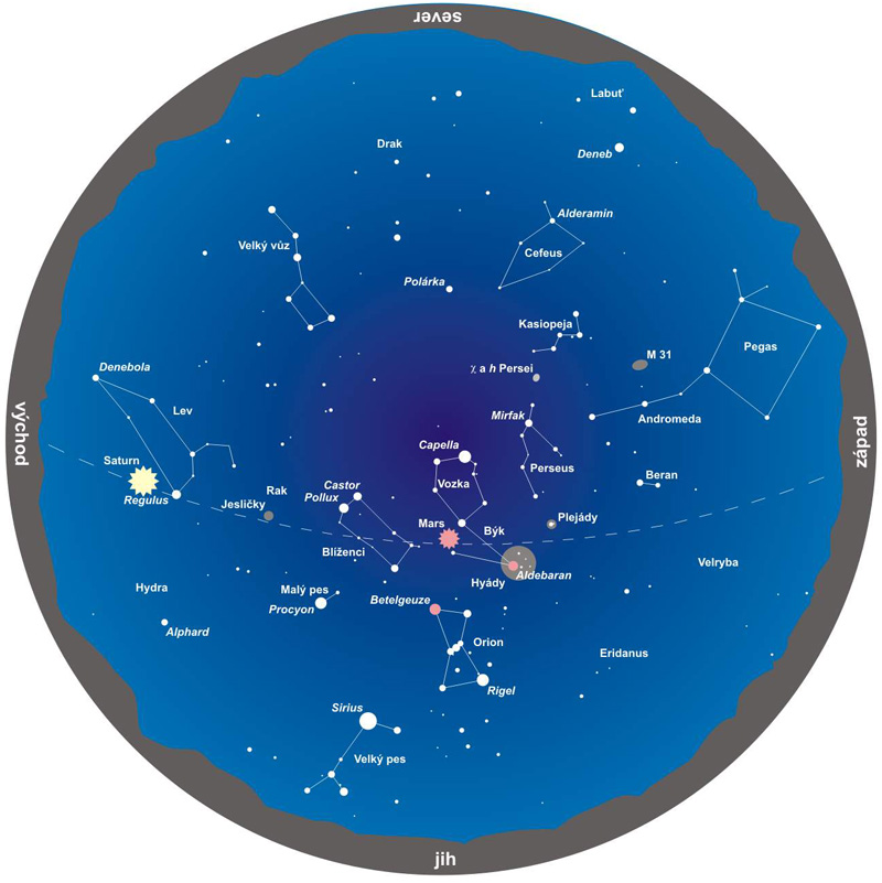 Zatmění Měsíce je nejen malebný astronomický úkaz, ale navíc se tentokrát odehraje v jednom z nejkrásnějších souhvězdí – ve Lvu. Jeho zadní tlapy a ocas na nebi tvoří jasná hvězda Denebola (β Leonis), přední nohy Regulus (α Leonis) a hrdě vztyčenou lví hlavu s bohatou hřívou Algieba (γ Leonis). Ostatně jméno poslední jmenované stálice pochází z arabského označení „al-jabha“, v překladu „Čelo“. Právě Algieba přitom představuje krásný objekt vhodný pro každý malý dalekohled: Skládá se totiž z dvojice nažloutlých hvězd vzdálených od sebe navzájem pět úhlových vteřin.