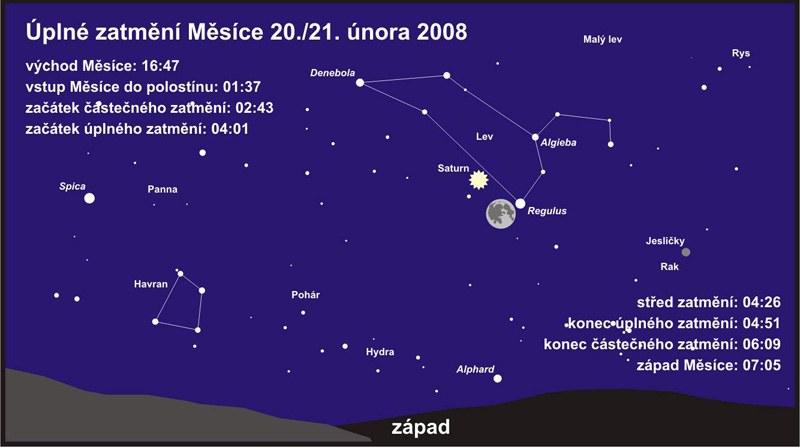 V noci z 20. na 21. února 2008 nastane úplné zatmění Měsíce. A bude to výjimečná podívaná! Náš kosmický soused se na obloze objeví kolem páté hodiny večerní. V té době sice na jeho úplňkovém kotouči nic mimořádného nezahlédneme, v těsné blízkosti však najdeme jasnou hvězdu Regulus ze souhvězdí Lva a také neméně nápadný Saturn.