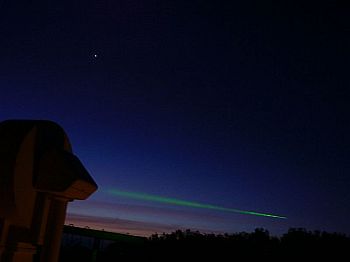 Na přiloženém snímku vidíte na hvězdném pozadí průlet družice Topex/Poseidon (slouží pro výzkum cirkulace vody v oceánech) -- to je ta jasná čára. Zdola zleva sleduje a osvětluje družici paprsek laseru, který je vidět díky rozptylu světla v atmosféře. Paprsek je záměrně přerušován každou sekundu, aby vytvořil na dráze družice časové značky pro naše měření polohy. Během krátké doby, kdy laser nesvítí (50 ms), je družice stále slabě viditelná díky osvětlení Sluncem. Konec dráhy je dán koncem CCD expozice (4 s). Zorné pole je asi 50'.