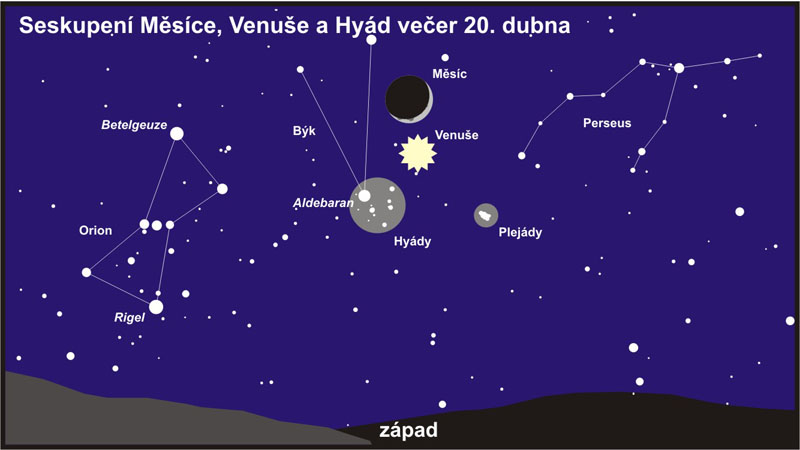 Na cestě oblohou se Venuše přiblíží hned k několika nápadným objektům. Všechno začne mezi 9. a 14. dubnem, kdy ji najdete poblíž otevřené hvězdokupy Plejády. O týden později se planeta ocitne u Hyád, druhé nápadné otevřené hvězdokupě ze souhvězdí Býka. Spolu s úzkým srpkem Měsíce a jasnou hvězdou Aldebaranem dokonce v pátek 20. dubna nakrátko vytvoří zajímavou ozdobu večerní oblohy. Samozřejmě jenom při pohledu ze Země, vždyť na Měsíc se budeme dívat ze vzdálenosti asi 370 tisíc kilometrů. Venuše se bude nacházet téměř pětsetkrát dál a Hyády dokonce pět miliardkrát dále než Měsíc!