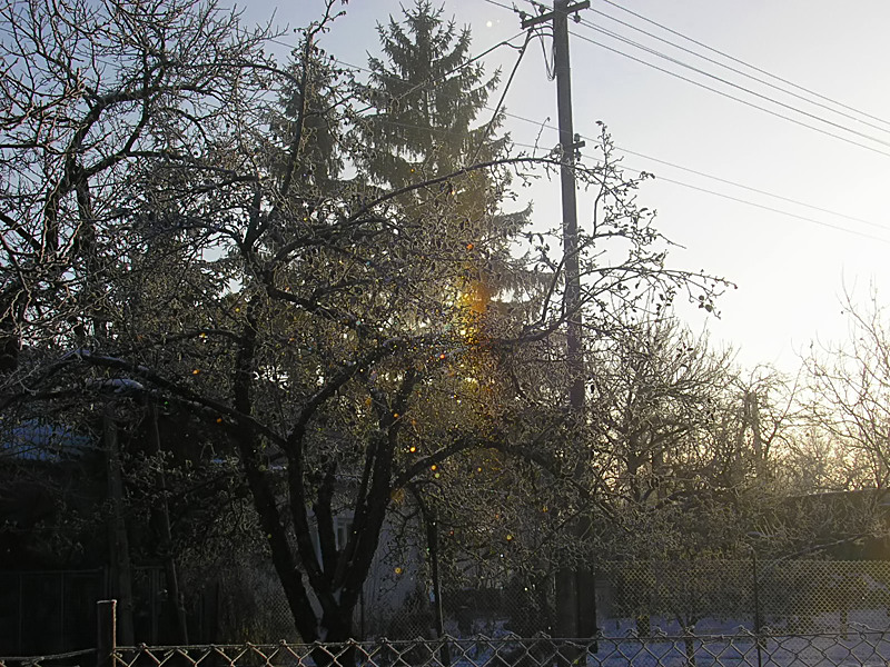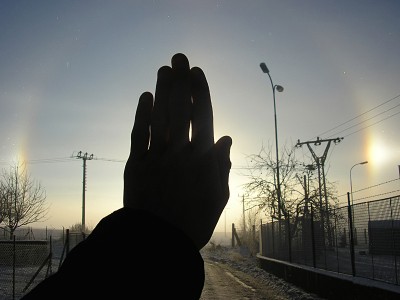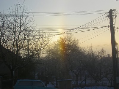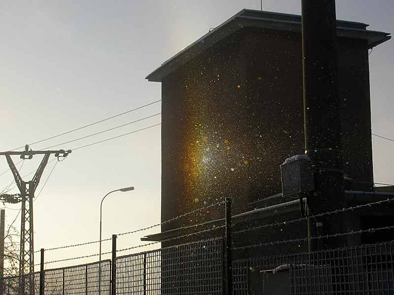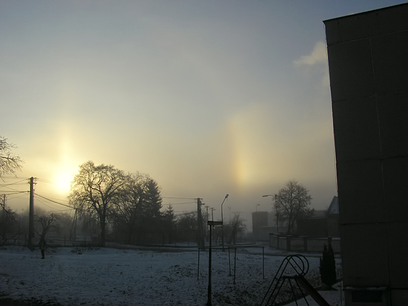 Následující den ráno jsem vyšel ven s úmyslem vyfotit paprsky v mlze, která se válela na nedalekém poli. Asi za půl hodiny jsem se s nepořízenou vracel. A najednou jsem pocítil, jak mě něco lehce píchá do tváří. Když jsem se podíval směrem k obloze, uviděl jsem... padající krystalky. Okamžitě jsem se otočil a po ujítí několika metrů, kdy mi ve výhledu přestaly vadit budovy, jsem uviděl krásné levé parhelium, slabší malé halo a horní část halového sloupu.