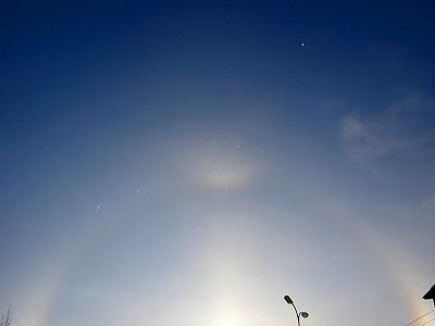 Parhelia byla opravdu zajímavá, zvláště když jsem se na ně zadíval na delší dobu oproti nějakému blízkému předmětu. Krásně byly vidět jednotlivé blýskající se barevné krystalky a zdálo se, že parhelium jakoby pluje na místě. Barvené krystalky jsou dobře patrné na následujících dvou obrázcích.