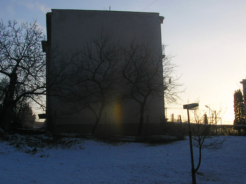 Dalších pár metrů chůze mi odhalilo i druhé parhelium, které se promítalo částečně na oblohu a částečně před stromy. A když jsem se kousek vrátil, zobrazilo se mi to samé parhelium na stěnu budovy. Byl to naprosto úžasný pohled - každý můj krok parhelium poslušně následovalo a "šlo" jako hodný pejsek stále kousek ode mě; pouze chvílemi se ztratilo. To když byla moje pozice vůči slunci nevhodná a paprsky tak nemohly zasáhnout oblast, kde by mělo parhelium být.