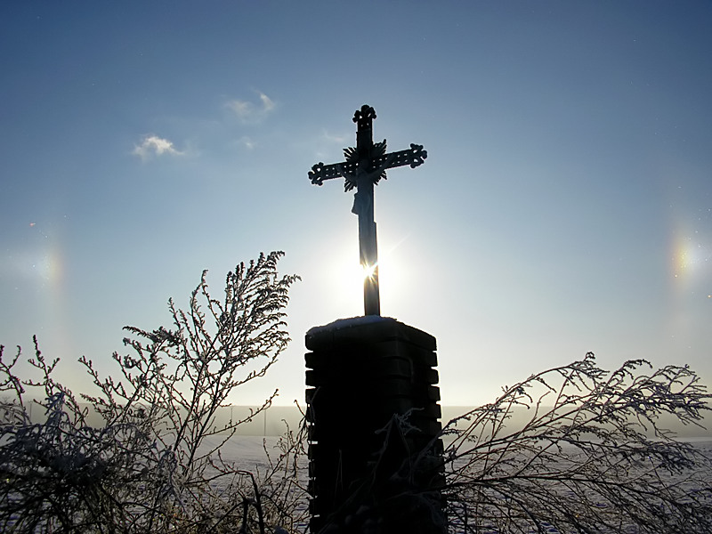 Samozřejmě, že parhelia nebyly jediné jevy, které jsem měl čest pozorovat. Kromě již zmíněného malého hala a horního halového sloupu, byl viditelný rovněž dolní sloup. Tento byl nejzajímavější když jsem stál na rozlehlém poli a sloup se táhnul od slunce prakticky až k mým nohám. Na pár okamžiků jsem na něm zahlédnul taky spodní slunce neboli subsun. Dolní sloup byl sice dost výrazný, ale hodně špatně se fotil. Na ukázku přikládám jeden jeho snímek.