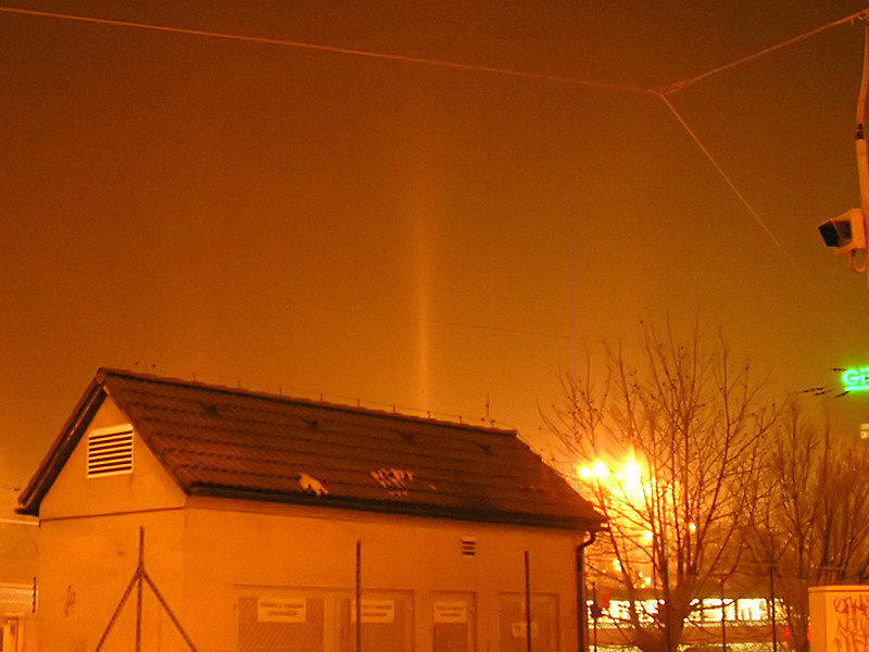 Kolem čtvrt na deset jsem si všimnul, že od několika lamp přede mnou se směrem nahoru táhnou slabé světelné sloupy - obdoba halových sloupů, které vznikají u slunce nebo měsíce, když jsou nízko nad obzorem. A pak to začalo: Krystalky se vyrojily v tak ohromném množství, až se zdálo, že sněží. Všechno kolem se rychle pokrývalo bělavou vrstvičkou spadaných krystalků a prakticky u všech silnějších světelných zdrojů v okolí se objevily jasnější či slabší halové sloupy a to jak horní tak dolní části. Určitě nepřeháním, když řeknu, že v maximu jsem měl možnost vidět dobrou stovku sloupů. Nejzajímavější však byly sloupy u reflektorů přibližujících se automobilů. S tím, jak se přibližovaly, tak docela rychle rostly do výšky a nabíraly na intenzitě a v několika případech též na jejich horních koncích bylo možné vidět, jak se rozštěpují ve dvě části a vytvářejí tak obdodu horního dotykového oblouku. Skutečně krásná podívaná. Bohužel, oblast padání krystalků přešla a sloupy zmizely tak rychle, jak rychle se objevily. A mě zůstala jen vzpomínka a pár nepovedených snímků. Později jsem se ještě vrátil s mikroskopem, abych prozkoumal napadané krystalky, což se mi nakonec i přes značné obtíže částečně povedlo, takže můžu říct, že padaly jak ledové destičky, tak sloupky a dokonce i nějaké pyramidální krystalky. Ze všeho nejvíc však bylo podlouhlých ledových jehliček.