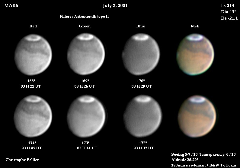 15.8.2003 od 2:00 do 2:40 SELC jsem pozoroval Mars. Použil jsem refraktor 60/700 se zvětšením 175x a 262x. Podmínky byly celkem slušné a to dovolilo větší zvětšení. V okuláru se mi ukázal krásný, velký = fakt velký, kulatý kotouč (není již deformovaný). Samozřejmě do očí bijící polární čepička. Hned jsem si ale všiml, že se zmenšila. Když jsem si vzpomněl jaká byla na začátku července a teď? Je opravdu menší! Doma na PC jsem se hned podíval na 2 snímky Ch. Pelliera (18cm Newton) ze 3.7.2003 a 13.8.2003 a myslím si, že rozdíl je patrný na první pohled. Dnes jsem si také přečetl pozorování z Úpické expedice, kde je zakreslena oblast Syrtis Major (mrzí mě, že jsem ji ještě letos neviděl, musím počkat, až se k nám zase nakloní). Mimo jiné je tam také poznámka, že na jižní polokouli začíná léto no a to je ten důvod, proč se čepička zmenšuje. Jinak jsem ještě na Marsu spatřil nějaký nevýrazný (velice slabý) albedový útvar táhnoucí se přes jižní oblast kotouče, lépe řečeno jižní část kotouče se mi zdála tmavší.