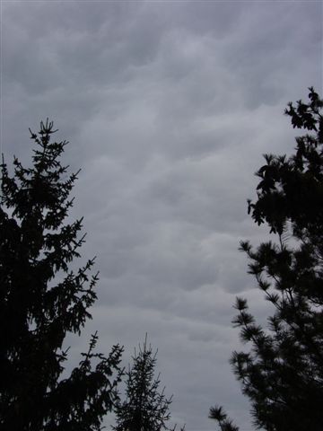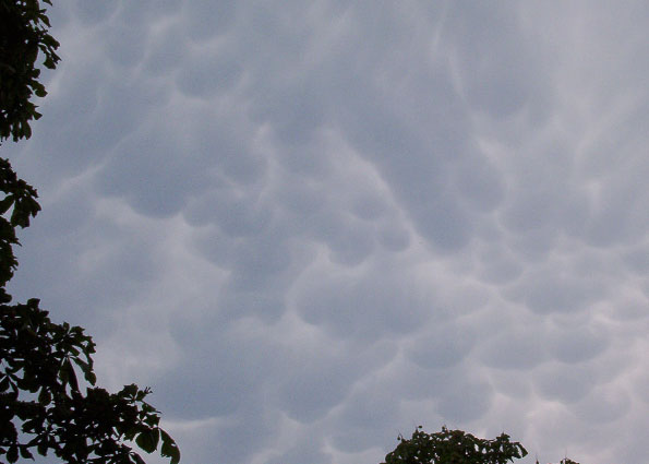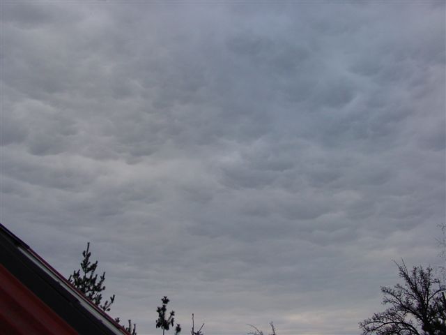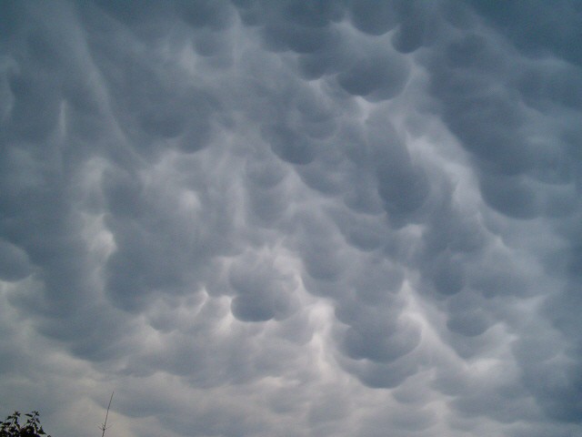 Nakonec se ještě zmíním o tom, jak mamma vzniká. Už jsem zmínil, že je spojena se sestupnými proudy, tedy klesajícím vzduchem. Tento vzduch je chladnější a tím pádem i těžší než okolní vzduch a právě z tohoto důvodu klesá. Při klesání se sice otepluje, ale vzhledem k tomu, že je nasycený, dochází uvnitř něj k odpařování vodních kapiček nebo ledových krystalků. Na odpařování je potřeba určité množství tepla, což má za následek, že se vzduch při svém klesání ochlazuje pomaleji než kdyby byl nenasycený vodní parou. Pokud je pro odpařování potřeba více energie než je vytvářeno oteplováním způsobeným klesáním vzduchu, pak vzduch bude pokračovat v klesání a budou se vytvářet oblačné výrůstky (mamma). U cirrovité oblačnosti je pak vznik mammy spojen především s vlněním ve vysoké vrstvě atmosféry. Na závěr ještě jeden snímek stratokumulu mamma.