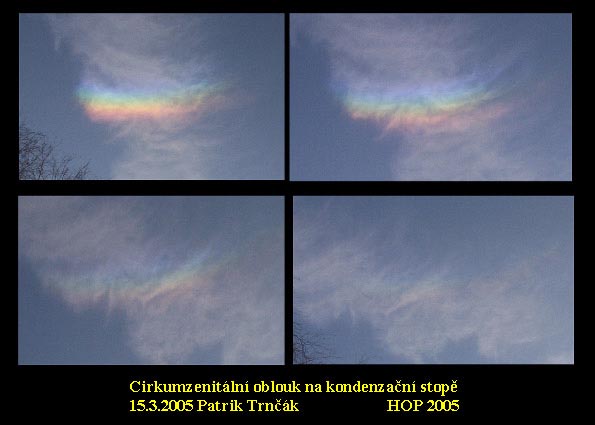 Cirkumzenitální oblouk se řadí k častým halovým jevům. Sem tam si ho všimneme nad naší hlavou, jak opisuje zenit. Někdy je úzký, někdy široký, někdy slabý, někdy jasný, ale málo kdy je mega jasný. Dnešní cirkumzenitální oblouk (CZO) byl jasnější než jakékoliv parhelia, která jsem kdy viděl. Takový úkaz patří do skupinky „brilliant bright“ čili briliantově jasný. Když jsem totiž viděl ono 120 stupňové parhelium z okna, tak jsem si všiml, že se oblak, na kterém vzniklo, šíří dále k východu a mohlo by na něm vzniknout i druhé 120 parhelium. Proto jsem na sebe hodil bundu a v nazouvácích vyběhl ven, do sněhu a kaluží. Pak jsem se jen letmo podíval nahoru a klesla mi čelist. Okamžitě jsem tasil foťák a mlátil snímky jak blázen. Zachytil jsem nejjasnější fázi a pak její konec, až CZO zmizel.