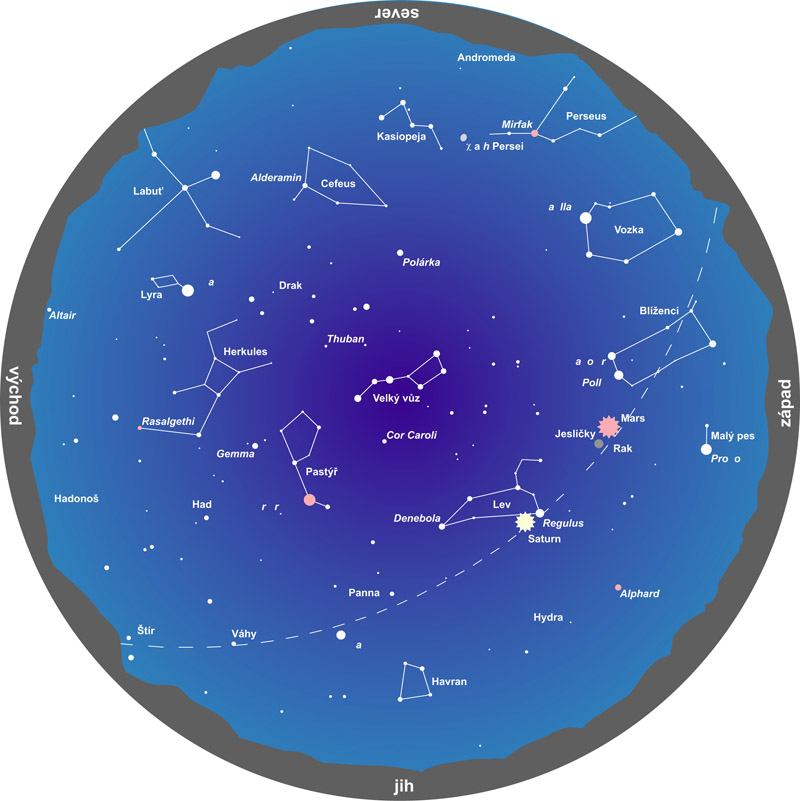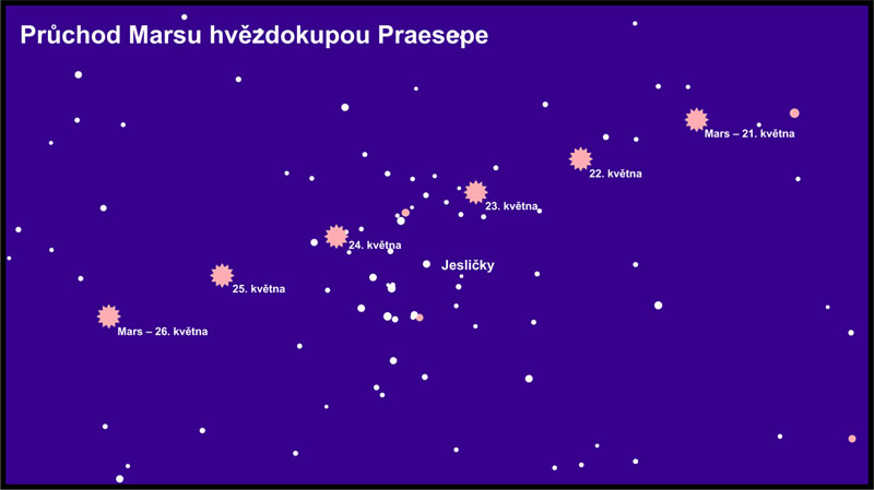 Velmi zajímavou návštěvu si pro zvídavé pozorovatele v květnu připravil i Mars. Mezi čtvrtkem 22. května a nedělí 25. května jej najdeme ve velmi nápadné otevřené hvězdokupě Praesepe v souhvězdí Raka, která představuje jednu z ozdob jarní oblohy.