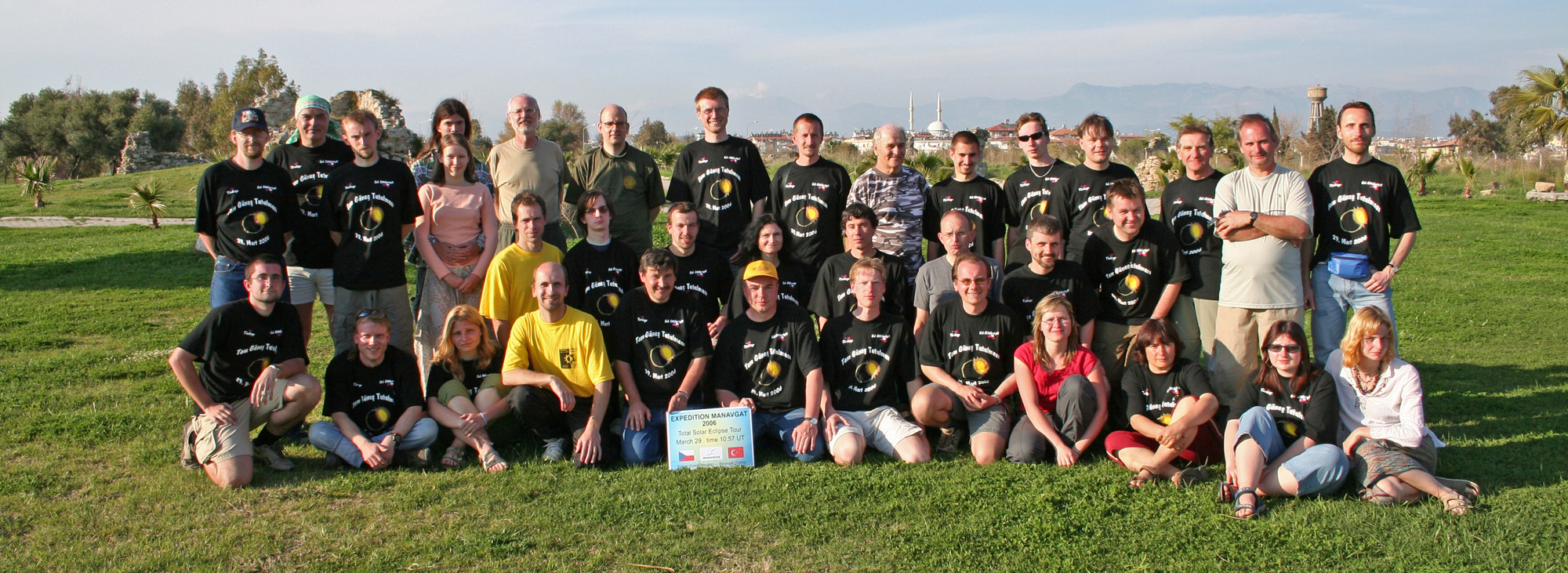 Úplné zatmění Slunce 29.3.2006 - Turecko Expedice Manavgat 2006 Probudil jsem se po hezké, jasné noci. Svítilo Slunce, tak jsem dal sušit rosou zvlhlý spacák a začal se připravovat na pozorování zatmění. Vybalil jsem triedr 10x50, a vytáhl fotoaparáty Zenit-E a Sokol f=50mm. Do fotoaparátů jsem zasunul filmy a poprosil jsem Martina Myslivce, aby mi zapůjčil předem slíbený objektiv Pentacon 200mm (ještě jednou díky!). Oba dva fotoaparáty jsem umístil na stativy. Na Zenita spolu s Pentaconem 200mm jsem dal 2x telekonvertor. Pro snímání částečného zatmění jsem umístil před objektiv baader folii a StarDustovi jsem pomohl s jeho kamerou a filtrem na ní. Na louce, na které jsme byli přišli další pozorovatelé (ne z naší skupiny). Do začátku zatmění zbývalo ještě trochu času, tak mi Zdeněk na GPS změřil naší polohu, abych mohl přibližně propočítat časy kontaktů (udělal jsem to s přesností na 1 až 2 sec.), doma jsem si předem vytisknul předpovědi z Calsky.com, ale až do zastavení na místě jsme přesně nevěděli odkud budem pozorovat . Místo: Turecko - kemp mezi Side a